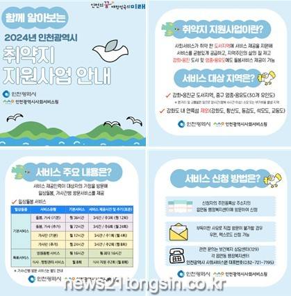 인천광역시는 강화·옹진 등 도서벽지 주민들도 지역에 관계없이 돌봄서비스를 이용할 수 있도록 이달부터 취약지 지원사업을 추진한다고 밝혔다.