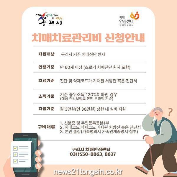 구리시(시장 백경현) 치매안심센터는 치매치료제를 복용하는 치매 환자를 대상으로 치매 치료관리비 지원 사업을 시행하고 있다.