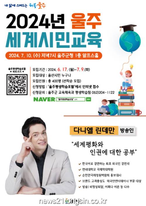 (뉴스21통신/우정석기자) = 울산시 울주군이 다음달 10일 울주군청 알프스홀에서 ‘2024년 울주 세계시민교육 명사특강’을 개최한다고 24일 밝혔다.