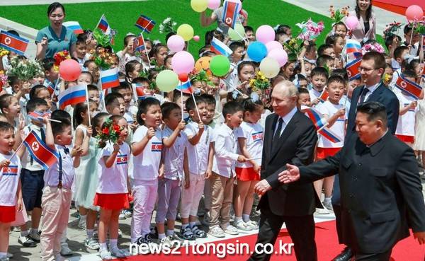 지난 19일, 블라디미르 푸틴 러시아 대통령이 김정은 북한 국무위원장과 평양 김일성 광장에 도착하자 북한 주민들과 아이들이 열렬히 환호했다.
