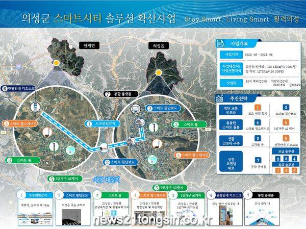 한편, 지난 5월에 스마트도시 솔루션 확산 사업에 최종 선정된 의성군은 총사업비 25억(국비 12.5, 지방비 12.5)을 투입해 노령인구 대상 스마트헬스케어, 1인가구 AI돌봄시스템 적용으로 촘촘한 돌봄시스템을 구축하고 스마트 횡단 보도, 스마트 폴, 도로위험 감지(블랙아이스 등), 스마트도시 통합플랫폼 구축으로 안전한 도시환경을 조성한다.