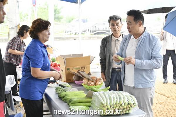 이날 장터에서는 20여 개의 판매, 홍보 부스가 마련돼 오이, 감자, 애플수박, 버섯, 옥수수, 파프리카, 대파, 다육이 등 농산물을 비롯해 콩물, 들기름, 장류 등 가공품과 지역 특산물을 판매했다. 또한, 창수면 주민자치회 소속 ‘애플밴드’의 신나는 연주와 난타 공연 등 다양한 볼거리도 함께 마련됐다.
