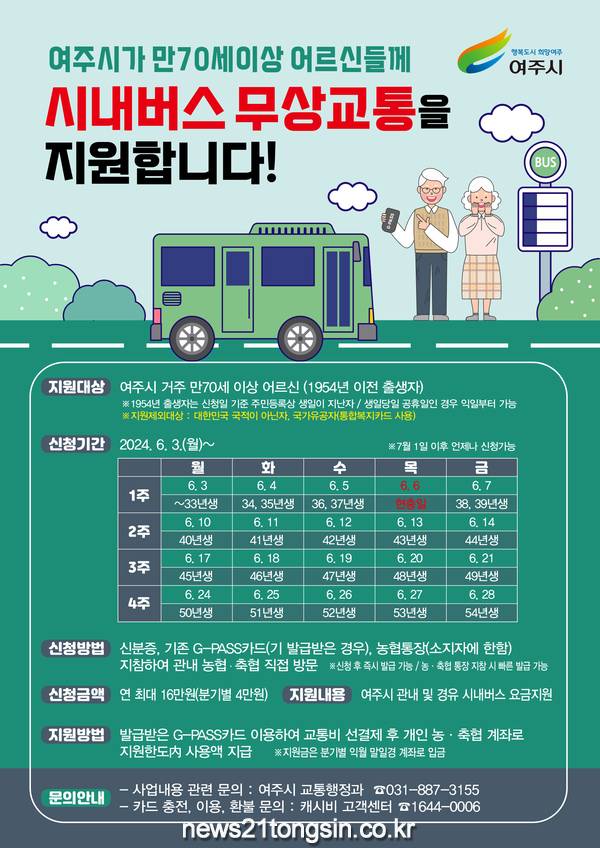 경기 여주시(시장 이충우)는 70세 이상 어르신들을 대상으로 하는 시내버스 무상교통 지원사업을 오는 7월 1일부터 본격 시행한다고 전했다. 이번 사업은 고령화 사회에 발맞춰 어르신들의 교통비 부담을 줄이고, 이동권을 보장함으로써 삶의 질 향상을 위해 마련되었다.