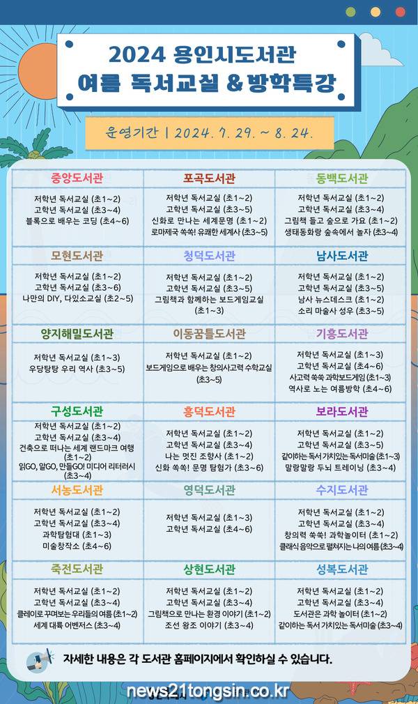 용인특례시(시장 이상일)는 여름방학을 맞아 지역 내 18개 공공도서관에서 초등학생을 대상으로 독서 교실과 방학 특강을 운영키로 하고 참여자를 모집한다.