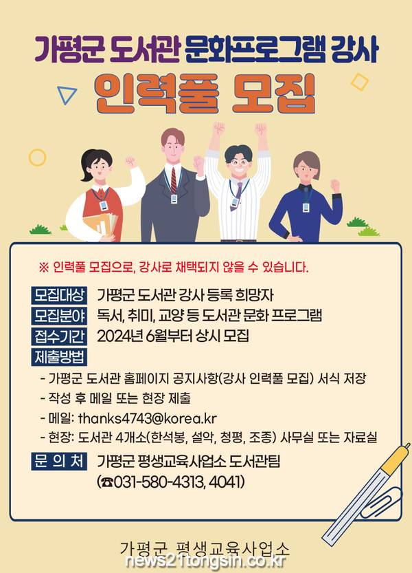 가평군(군수 서태원)은 관내 4개 도서관(한석봉, 설악, 청평, 조종)에서 활동할 문화프로그램 강사 인력풀을 모집한다며 많은 참여를 당부했다.