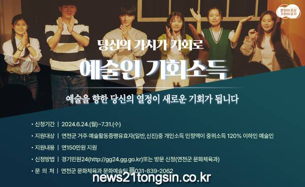 연천군은 오는 7월 31일까지 경기도 예술인 기회소득 신청을 받는다고 밝혔다.
