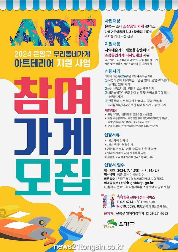 은평구(구청장 김미경)는 1일부터 오는 14일까지 지역예술가와 협업해 소상공인 가게의 환경을 개선하는 ‘2024년 우리동네가게 아트테리어 지원’ 참여 가게를 모집한다고 밝혔다.