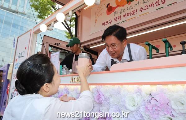 박강수 마포구청장은 민선 8기 2주년 첫날인 7월 1일 오전, 구청 앞 광장에 마련된 ‘사랑의 커피차’에서 직원들에게 직접 커피를 건네며 격려의 말을 전했다.