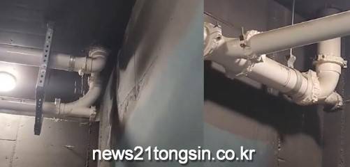 한 아파트의 지하주차장 천장에서 물이 줄줄 쏟아지고, 배관 이음새 곳곳에서도 물이 새어나와 주차장 바닥은 물이 흥건히 고였다.