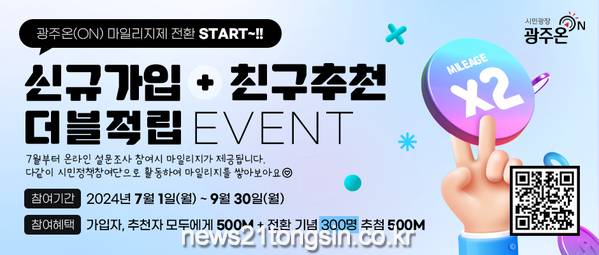 광주시는 광주온(ON) 마일리지제 도입을 기념해 ‘신규 가입’·‘친구 추천’ 더블적립 이벤트를 7월부터 9월까지 진행한다. 기존 시민 정책참여단이나 신규 가입자가 가족, 지인 등을 새로 추천하면 500마일리지를 제공하며, 매월 100명을 추첨해 500마일리지를 추가로 적립해 준다.