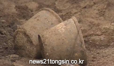 문화재 조사를 위해 2m 깊이로 파놓은 매장지, 모래와 흙으로 된 벽면 한쪽이 완전히 무너졌다.