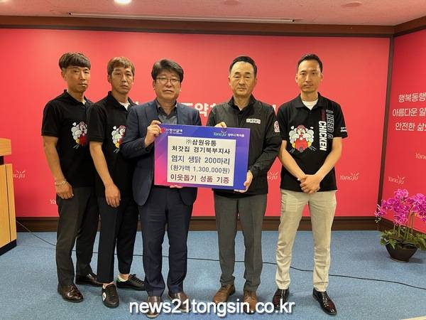 양주시 백석읍(읍장 백승호)은 ㈜삼원유통 처갓집 경기북부지사(본부장 곽동헌)에서 3일 오전 행정복지센터를 방문해 염지 생닭 200마리(환가액 1,300천원)를 전달했다고 밝혔다.