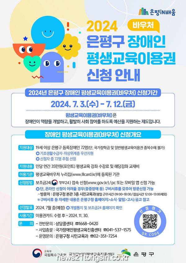 은평구(구청장 김미경)는 오는 12일까지 장애인의 평생교육 참여기회 확대와 역량개발 지원을 위한 ‘장애인 평생교육이용권’ 이용자를 모집한다고 밝혔다.