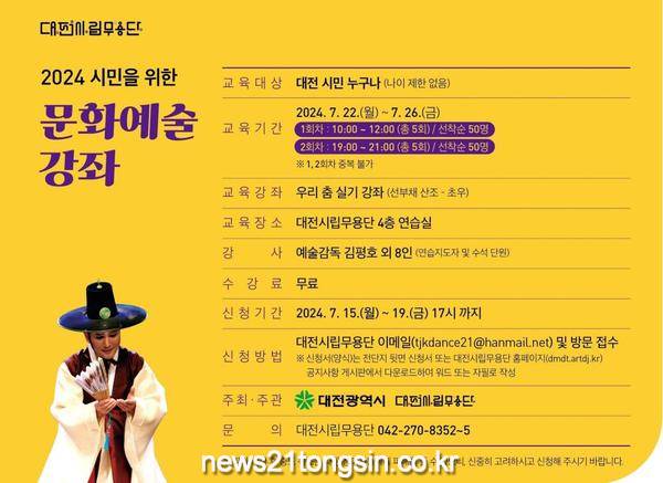 문화예술강좌에 관한 기타 자세한 사항은 대전시립무용단 홈페이지(dmdt.artdj.kr)를 참조하거나, 전화(042-270-8353~5)로 문의하면 된다.