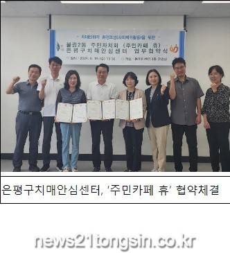은평구(구청장 김미경)는 지난 19일 은평구치매안심센터와 불광2동 주민자치위원회 운영회가 운영하는 ‘주민카페 휴’와 업무협약을 체결했다.