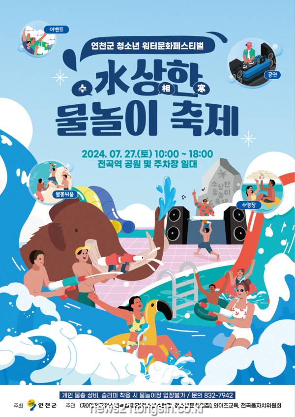 (재)연천군청소년육성재단은 오는 27일 전곡역 광장에서 ‘水상한 물놀이축제-청소년 워터·문화페스티벌’을 개최한다.