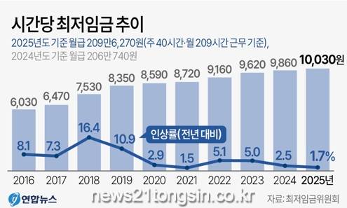 025년도 최저임금이 처음으로 1만원을 넘긴 1만30원으로 결정됐다.