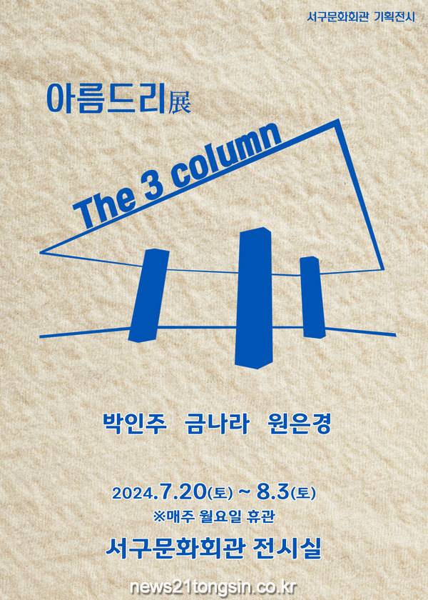 (뉴스21통신) 최우성기자 = 대구 서구문화회관은 The 3column‘아름드리’展으로 박인주, 금나라, 원은경 작가를 초대하여 7월 20일(토)부터 8월 3일(토)까지 13일간 서구문화회관 전시실에서 개최한다고 밝혔다.