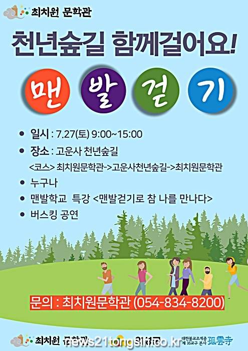 의성군은 오는 7월 27일(토) 최치원문학관 및 고운사 일원에서 천년숲길 맨발걷기 행사를 개최한다고 밝혔다.