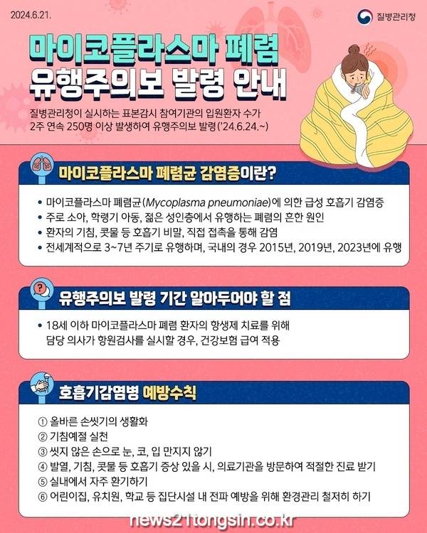 장성군이 질병관리청의 마이코플라스마 유행주의보 발령에 따라 호흡기 감염병 예방수칙 준수를 당부했다.군에 따르면, 마이코플라스마 폐렴균 감염은 최근 4주 동안 전국적으로 1.7배 증가했다. 이전까지는 3~4년에 한 번씩 유행하다가 지난 겨울에 이어 올해 다시 유행하는 등 주기가 짧아졌다.마이코플라스마 폐렴균에 의해 유발되며 주로 5~9세 아이들에게 발생한다. 경미한 감기 증상을 보이지만 폐렴, 폐농양, 기관지 확장증 등 합병증으로 번질 수 있어 주의를 요한다.콧물, 타액 등을 통해 호흡기로 전파되는 특성상 어린이집, 유치원, 학교 등 집단시설이나 가족 간 감염이 쉽게 일어난다. 기침 예절 준수, 개인 위생 등에 신경쓰고, 감염이 의심되면 의료기관에 방문해 마이코플라스마 폐렴균 항원검사를 받는 등 정확한 진단과 치료가 필요하다.장성군 보건소 관계자는 “마이코플라스마 폐렴은 백신이 없어, 예방과 적극적인 대응이 중요하다”며 “유행주의보 발령 기간에는 18세 이하 주민에 대한 항원검사비에 건강보험을 적용해 부담을 경감시키고 있다”고 안내했다. 자세한 내용은 장성군 보건소 감염병대응팀(061-390-7175)에 문의하면 된다.