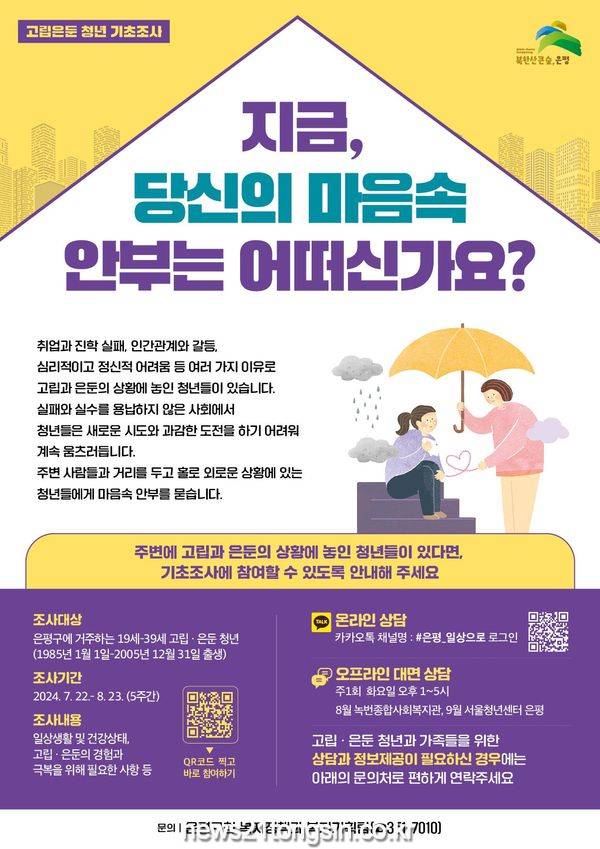 김미경 은평구청장은 “은둔과 고립으로 도움의 손길을 기다리는 청년들을 적극적으로 발굴하고, 이번 기초조사를 계기로 사회적 고립과 은둔을 해소할 수 있는 정책을 추진해 나가겠다”고 말했다.