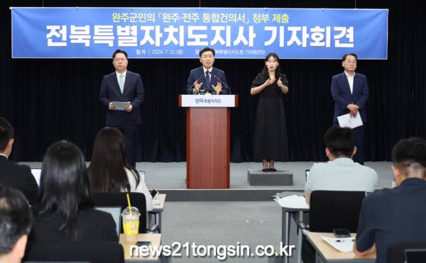 김 지사는 이날 도청 브리핑룸에서 가진 기자회견에서 “완주 전주 통합시를 광역시에 버금가는 강하고 단단한 전북의 중추도시로 만들겠다”고 강조했다.