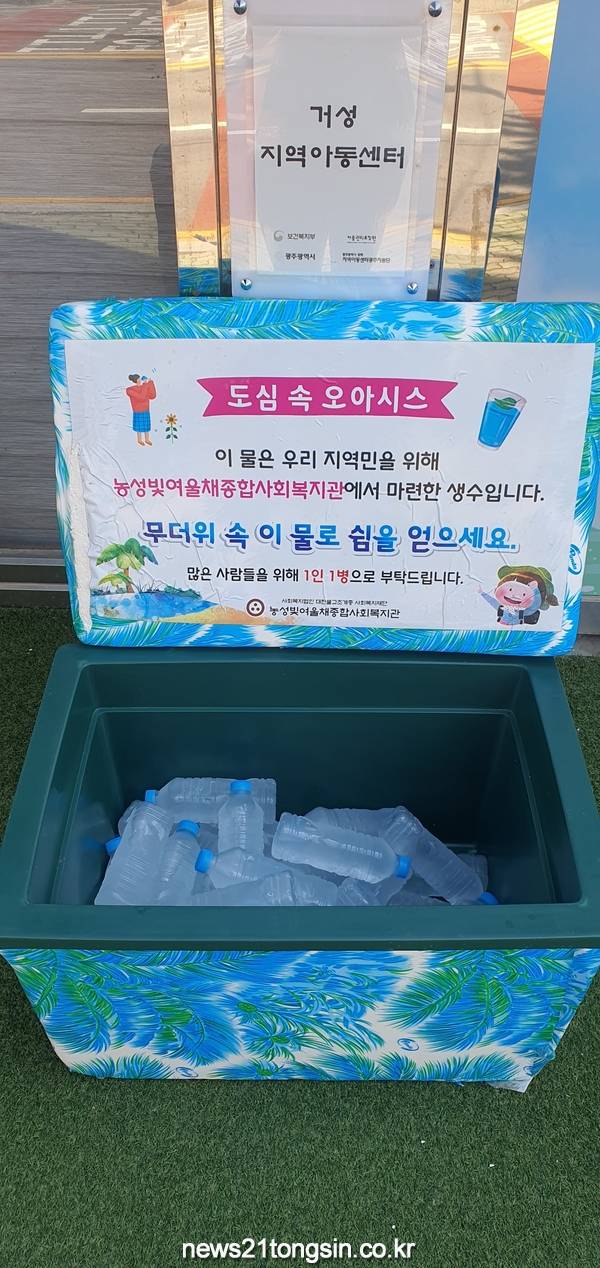'도심 속 오아시스'는 2021년부터 4년째 진행 중인 사업으로 올해부터 4개동 행정복지센터와 함께 7월 말부터 8월 중순 까지 유동 인구가 많은 농성2동 파출소 앞, 농성동 돌고개역 앞, 양동 양동시장 앞, 양3동 거성지역아동센터 앞, 농성빛여울채복지관 늘푸른도서관 앞 5곳과 농성1동, 농성2동, 양동, 양3동 행정복지센터 앞 총 9곳에 아이스박스를 비치하여 매일 500ml 얼음생수 1000병을 무료로 공급하고 있다.