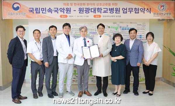 지난 24일 원광대학교병원(병원장 서일영)은 외래동 3층 일원홀에서 국립민속국악원(원장 김중현)과 서일영 병원장, 김중현 국립민속국악원장을 비롯한 주요 업무관계자들이 참석한 가운데 업무협약을 체결했다고 밝혔다.