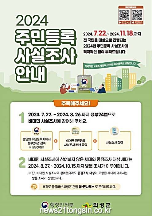 의성군은 오는 11월 18일까지 전 군민을 대상으로 2024년 주민등록 사실조사를 실시한다고 밝혔다.