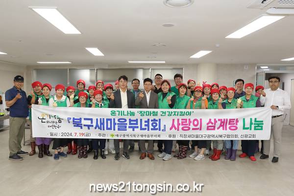 (뉴스21통신) 심수연기자 = 대구북구새마을부녀회(회장 양미경)는 7월 19일(금) 대현동 신광교회에서 각 동 부녀회장 등 30여 명이 참여한 가운데 온기가 넘치는 사랑의 삼계탕 나눔 행사를 실시했다고 밝혔다.