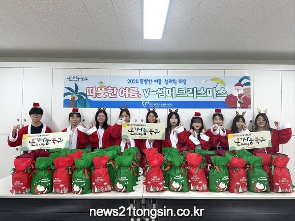 ‘2024 따뜻한 여름, V-썸머크리스마스’는 폭염으로 어려움을 겪는 아동들에게 비치타올, 수딩젤 등 여름용품 및 학용품, 간식이 담긴 선물꾸러미를 제작하여 전달하는 행사로, 산타로 변신한 자원봉사자들이 관내 지역아동센터 아동들에게 선물꾸러미를 전달하며 소중한 추억을 함께 만드는 시간을 가졌다.
