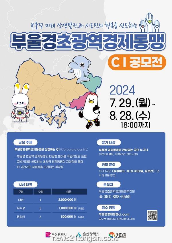 (뉴스21통신/우정석기자) = 울산시는 부산시, 경상남도와 함께 7월 29일부터 8월 28일까지「부울경초광역경제동맹 상징(CI)」공모전을 개최한다고 밝혔다.