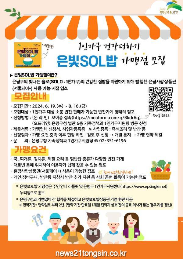 은평구(구청장)는 저소득 중장년 1인가구를 대상으로 건강한 식생활을 지원하는 ‘은빛SOL밥’ 사업에 참여할 반찬가게 가맹점을 내달 16일까지 모집한다고 밝혔다.