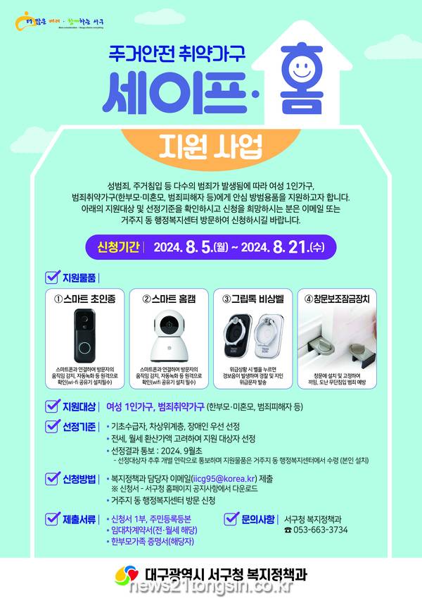 (뉴스21통신) 최우성기자 = 대구광역시 서구는 관내 여성 1인가구, 범죄취약가구 등을 대상으로 「주거안전 취약가구 세이프-홈」지원 사업을 추진한다고 밝혔다.