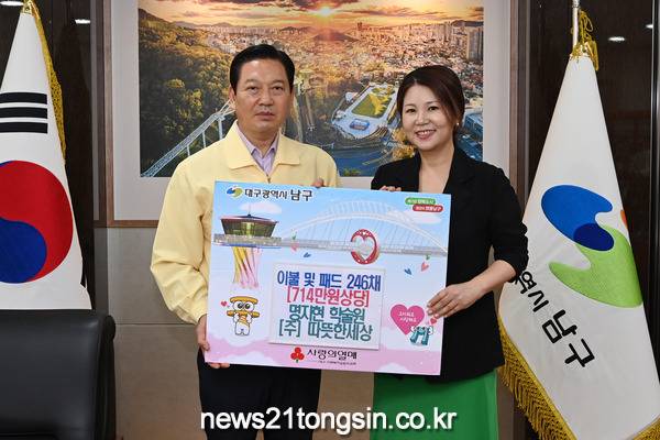 (뉴스21통신) 황태원기자 = 대구 남구는 지난 7월 29일, 명지현학술원과 ㈜따뜻한 세상이 이불 및 패드 246채(714만원상당)을 기탁했다고 밝혔다.