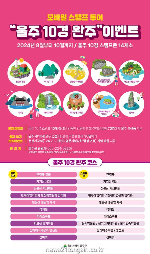 (뉴스21통신/우정석기자) = 울산시 울주군이 ‘울주 10경’ 신규 선정을 기념해 이달부터 오는 10월까지 모바일 스탬프투어 ‘울주 10경 완주’ 이벤트를 운영한다고 1일 밝혔다.