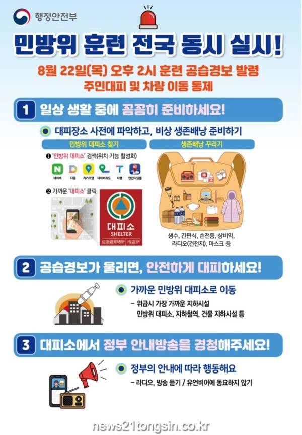 (뉴스21통) 최우성기자 = 8월 22일(목) 오후2시 제389차 민방위의 날 훈련을 실시한다고