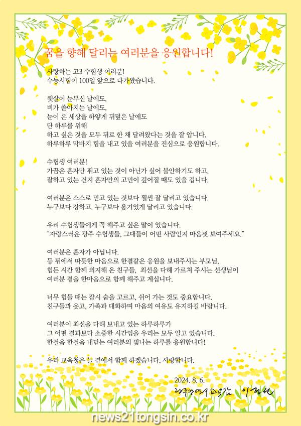 이 교육감은 서한문에서 “자랑스러운 광주 수험생들, 그대들이 어떤 사람인지 마음껏 보여주라”며 “여러분들 곁에는 부모님, 친구들, 선생님들, 광주교육가족 모두가 한마음으로 함께하고 있으니 수능시험이 끝나는 순간까지 최선을 다해 주기 바란다”고 밝혔다.