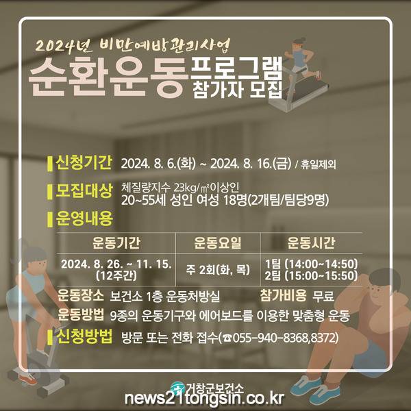 거창군은 6일부터 16일까지 2주간 비만예방관리사업 ‘순환운동 프로그램’ 참여자 18명을 선착순 모집한다고 6일 밝혔다.