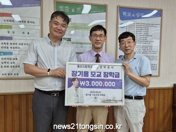 (뉴스21통신/우정석기자) = 울산 중구 울산고등학교(교장 김주호)는 7일 배우 장기용(울산고 55회 졸업) 지원 단체(서포트팀)‘최애굥’으로부터 장학금 300만 원을 전달받았다.