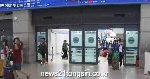 파란색 단체복을 입은 필리핀 가사관리사 100명이 입국장으로 들어온다.