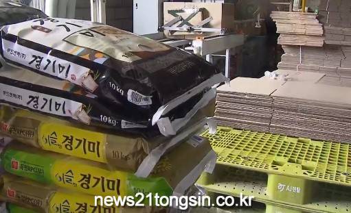 경기도 하남에 있는 한 농업회사법인 창고, 쌀 포대와 택배 상자가 쌓여 있다.