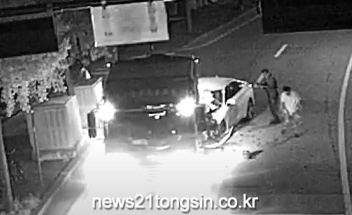 환경미화원들이 도롯가에 쌓인 쓰레기를 차량에 옮기는 중 갑자기 흰색 승용차 한 대가 빠르게 달려오더니, 미화원들이 있는 청소차 뒷부분을 그대로 들이받는다.