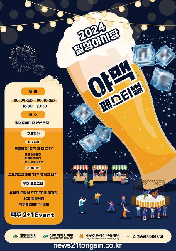 (뉴스21통신) 최우성기자 = 대구광역시와 대구전통시장진흥재단은 연이은 폭염으로 무더위에 지친 시민들에게 신천강변에서 시원한 여름밤을 즐길 수 있도록 ‘2024 칠성야시장 야맥 페스티벌’을 8월 9일(금), 10일(토) 양일간 칠성야시장에서 개최한다.