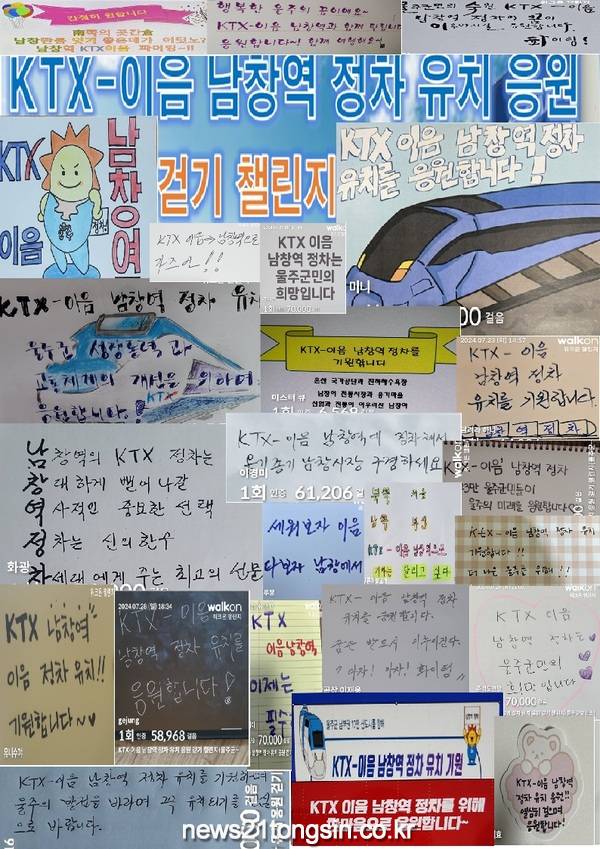 (뉴스21통신/우정석기자) = 울주군보건소가 지난달 중순부터 말까지 KTX-이음 남창역 정차 유치 응원 걷기 챌린지를 성황리에 운영했다고 12일 밝혔다.
