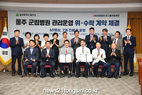 (뉴스21통신/우정석기자) = 울산시 울주군이 13일 군청에서 이순걸 군수와 최길영 군의장, 의료법인 온그룹의료재단 관계자들이 참석한 가운데 울주군립병원 관리운영 위수탁 계약을 체결했다.