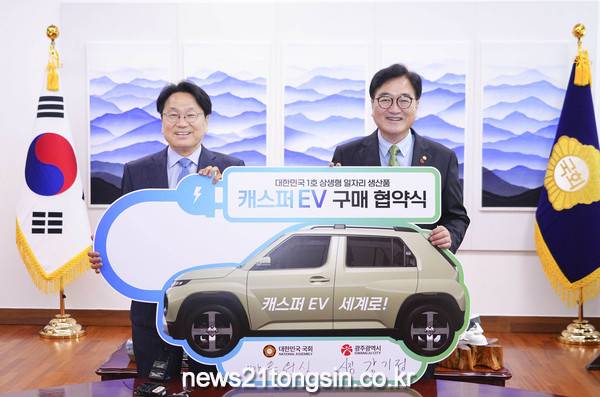 광주광역시와 국회는 13일 오전 국회에서 ‘캐스퍼EV 구매협약’을 체결했다. 협약식에는 강기정 광주시장과 우원식 국회의장 등이 참석했다.