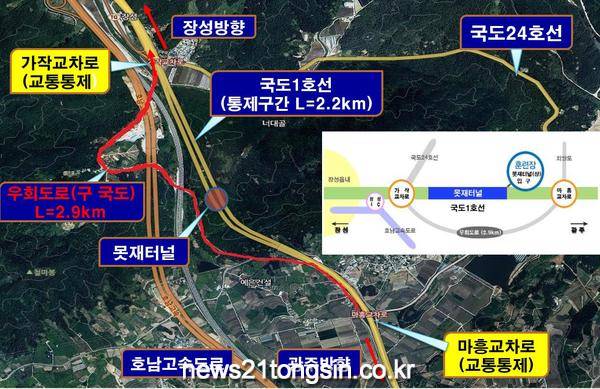 ▲ 장성 못재터널 우회도로 지정 운영 계획(을지연습)익산지방국토관리청(청장 안경호)은 8월 21일 수요일 전남 장성군 진원면 국도1호선 못재터널(상행,장성방향)에서 도로 터널 붕괴사고(원인미상의 폭발)를 가정한 을지연습 현장훈련을 실시한다고 밝혔다.