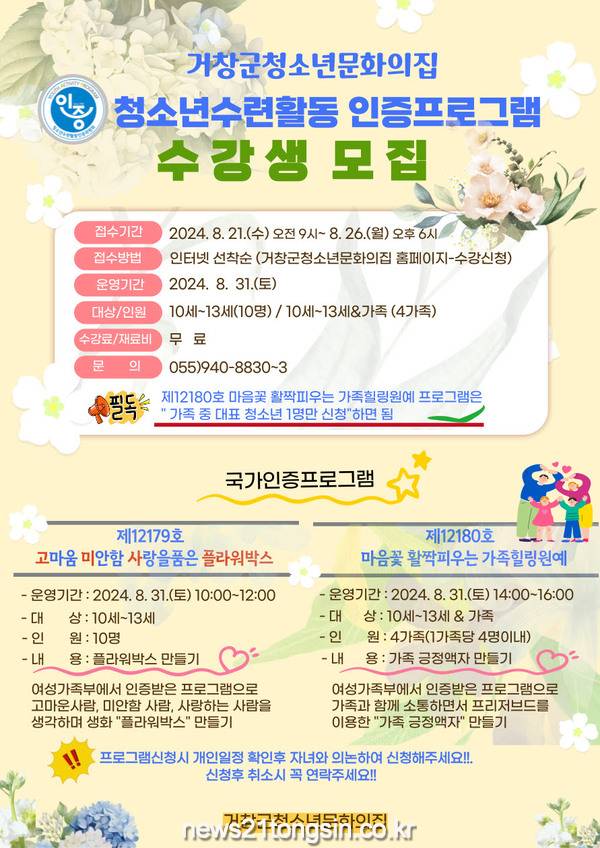 프로그램 수강신청은 청소년수련활동 인증프로그램의 경우 8월 21일 오전 9시부터 8월 26일까지, 하반기 프로그램은 9월 6일부터 9월 11일까지 거창군청소년문화의집 홈페이지에서 선착순으로 진행되며, 수강료 및 재료비는 무료이다.