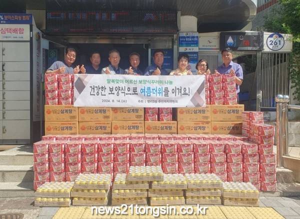 (뉴스21통신 최우성기자 = 대구 서구 평리3동주민자치위원회(위원장 노민석)는 14일 말복을 맞아 관내 어르신 200세대에 삼계탕, 라면, 식혜 등 건강 꾸러미를 후원했다.